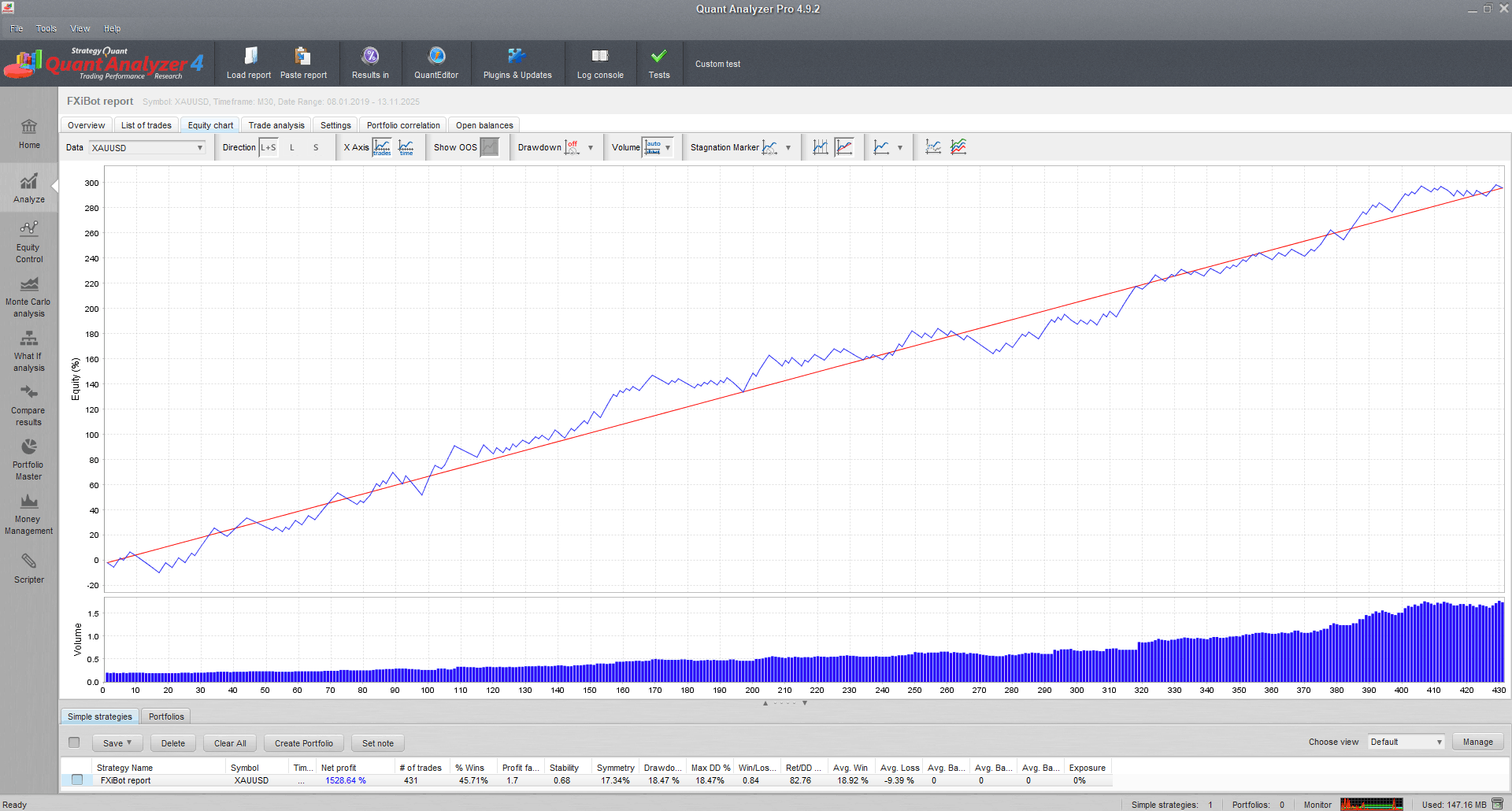 FXiBot utilizes a formula‑driven pattern recognition model that goes beyond static formations or predefined setups. Instead, it uncovers hidden market structures, providing an analytical edge. It adapts dynamically to trending or ranging conditions, maintaining robustness across different environments, while trades are executed with strict risk parameters and a defined reward‑to‑risk ratio, supported by a position management system that scales exposure in line with account growth.